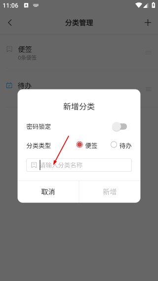 4、在【新增分類】彈窗里,選擇分類類型(如便簽),在輸入框填寫分類名稱后,點擊“新增”按鈕完成分類創(chuàng)建。