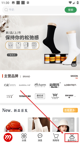 2、在【首頁(yè)】頁(yè)面可瀏覽新品、主營(yíng)品牌,點(diǎn)擊底部導(dǎo)航欄的【會(huì)員中心】按鈕,可切換至?xí)T中心頁(yè)面。
