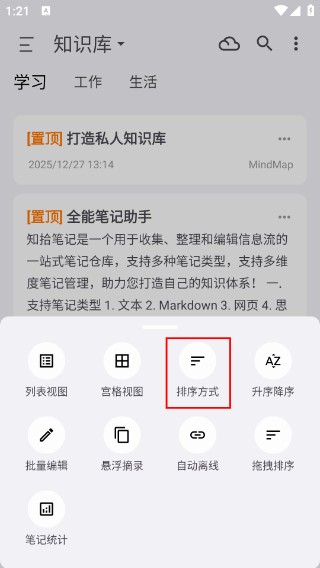 3、在【知識(shí)庫(kù)】頁面呼出功能菜單,可找到【排序方式】選項(xiàng),此功能用于調(diào)整筆記在頁面中的展示排列順序。