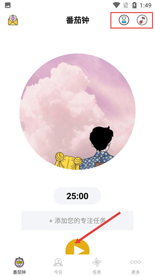 1、在番茄鐘主界面,點擊底部播放按鈕,彈出“請選擇今日任務(wù)”的選擇彈窗,界面顯示計時25:00及添加專注任務(wù)的提示。