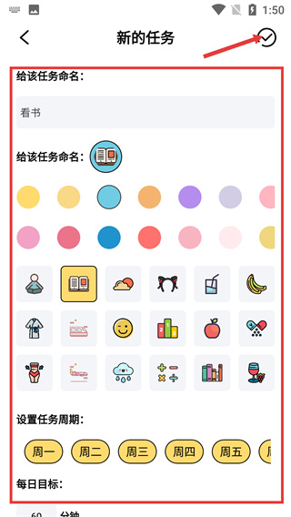 3、在“新的任務(wù)”頁面,將任務(wù)命名為“看書”并選定對應(yīng)圖標(biāo)和信息后,點擊右上角對勾按鈕保存該任務(wù)。