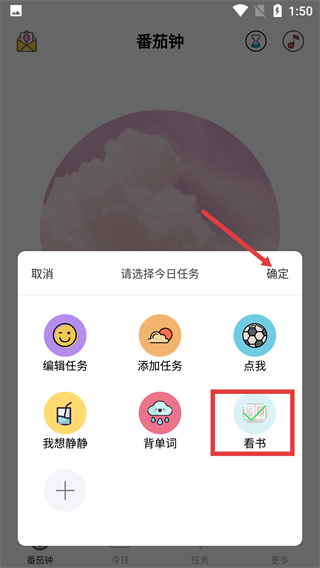 4、回到任務(wù)選擇彈窗,選中新增的“看書”任務(wù),點擊“確定”按鈕,完成今日專注任務(wù)的選擇。