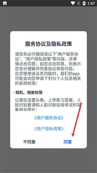 1、閱讀【服務協(xié)議及隱私政策】,了解需授權的【相機-相冊權限】后,點擊彈窗中的【同意】按鈕,即可進入后續(xù)操作頁面。