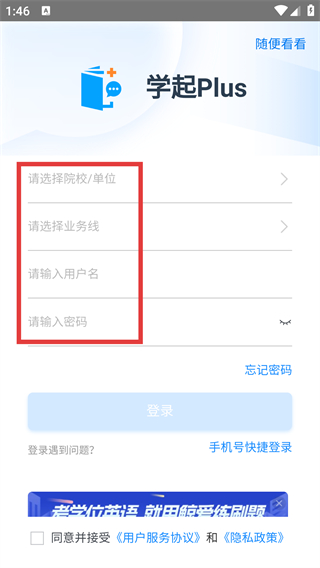 2、進入【學起Plus】登錄頁,需先選擇【院校/單位】-【業(yè)務線】,再填寫【用戶名】-【密碼】,完成后可進行登錄操作。