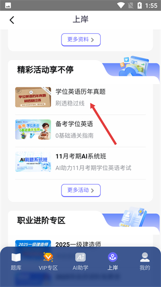 3、進入【上岸】頁面,可在【精彩活動享不?!堪鍓K找到【學位英語歷年真題】等資源,點擊【更多資料】-【更多活動】查看更多內(nèi)容。
