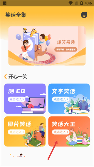 1、進(jìn)入笑話全集首頁,找到“開心一笑”板塊下的【笑話大王】選項(xiàng),點(diǎn)擊“點(diǎn)擊進(jìn)入”按鈕,進(jìn)入笑話大王頁面。