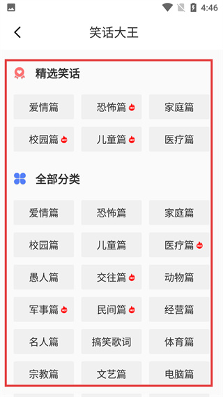 2、進(jìn)入笑話大王頁面后,可見【精選笑話】與【全部分類】板塊,包含愛情篇、恐怖篇等多種笑話分類標(biāo)簽。