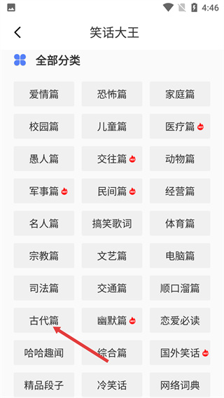 3、在全部分類區(qū)域中,找到并點(diǎn)擊【古代篇】分類標(biāo)簽,進(jìn)入古代主題的笑話內(nèi)容展示頁面。