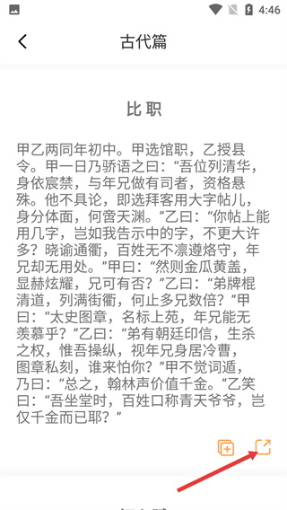 4、進(jìn)入古代篇頁面后,可查看對應(yīng)笑話內(nèi)容,還能通過頁面右下角的分享按鈕,分享當(dāng)前笑話內(nèi)容。
