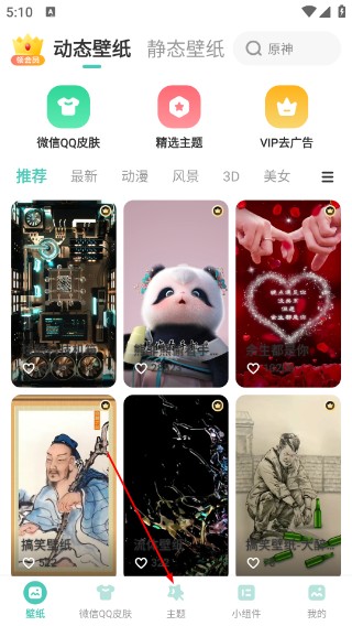 1、在【動(dòng)態(tài)壁紙】頁(yè)面,可瀏覽各類壁紙內(nèi)容,點(diǎn)擊底部【主題】選項(xiàng),進(jìn)入主題相關(guān)的選擇頁(yè)面。