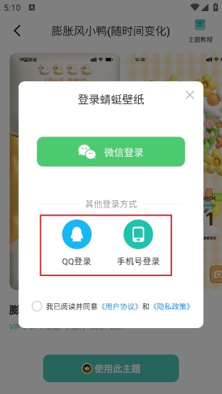 4、在【登錄蜻蜓壁紙】彈窗中,選擇【微信登錄】-【QQ登錄】等方式,勾選協(xié)議后完成登錄,即可使用該主題。