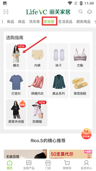 1、進入LifeVC麗芙家居首頁,點擊頂部分類欄的【家居服】標簽,進入家居服分類頁面,選擇【睡衣】選項。