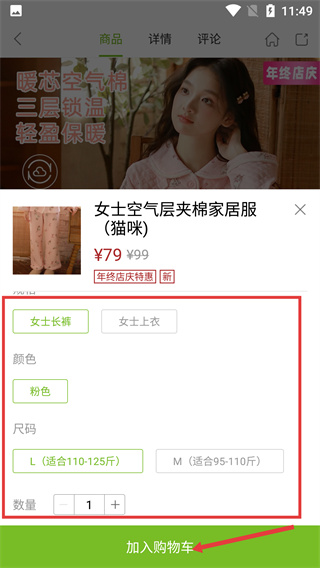 3、在商品詳情頁,點擊底部的【加入購物車】按鈕,調(diào)出包含品類、顏色、尺碼等選項的規(guī)格選擇彈窗。