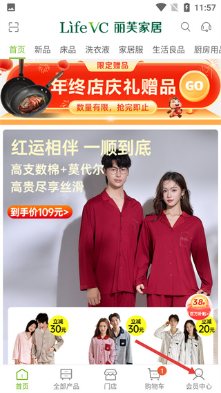 1、進入LifeVC麗芙家居首頁,點擊底部導航欄的【會員中心】選項,進入會員功能匯總頁面。