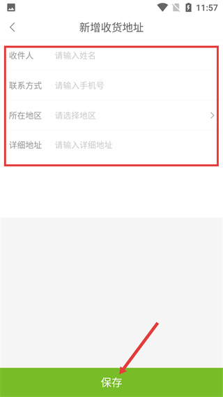 4、在新增收貨地址頁面,依次填寫收件人、聯(lián)系方式、所在地區(qū)、詳細地址等信息后,點擊【保存】按鈕,完成收貨地址的添加操作。