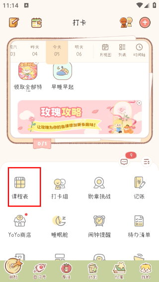1、在打卡頁(yè)面找到【課程表】選項(xiàng)并點(diǎn)擊,進(jìn)入課程表的添加配置流程頁(yè)面,啟動(dòng)課程表創(chuàng)建操作。