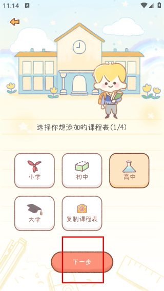2、在課程表類型選擇頁(yè)面選定對(duì)應(yīng)學(xué)段后,點(diǎn)擊【下一步】按鈕,進(jìn)入信息填寫(xiě)環(huán)節(jié)。