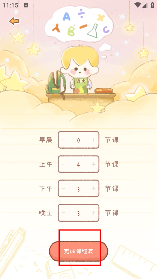 4、在課程時(shí)段配置頁(yè)面設(shè)置各時(shí)段課程數(shù)量后,點(diǎn)擊【完成課程表】按鈕,完成課程表的創(chuàng)建操作。