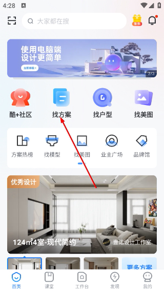 1、在首頁找到“找方案”選項(xiàng)并點(diǎn)擊,進(jìn)入裝修方案的精選展示頁面,瀏覽各類裝修設(shè)計(jì)方案。