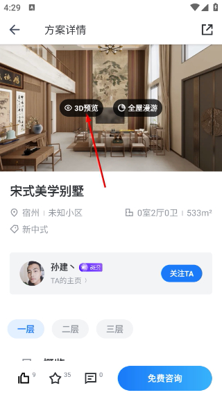 2、進(jìn)入找方案的精選頁面后,點(diǎn)擊目標(biāo)方案如“宋式美學(xué)別墅”,即可進(jìn)入該方案的詳情介紹頁面。