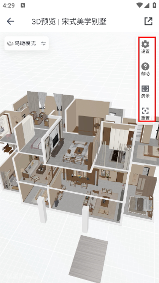 4、進(jìn)入3D預(yù)覽頁面后,可通過右側(cè)的設(shè)置、幫助等功能按鈕,操作查看該裝修方案的3D模型效果。