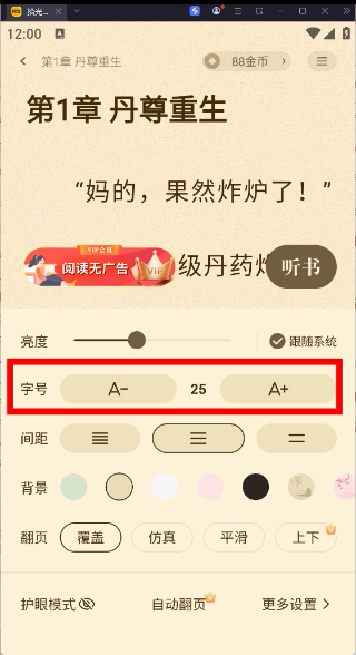 4、在閱讀設(shè)置界面,通過“字號”區(qū)域的“A-”“A+”按鈕,調(diào)整閱讀內(nèi)容的文字大小以適配閱讀習(xí)慣。