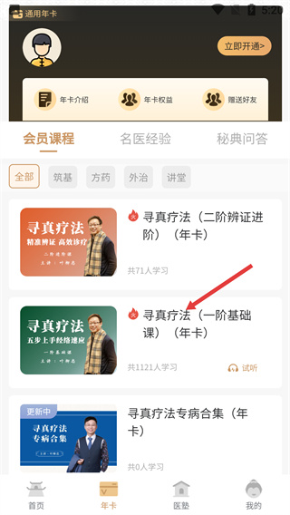 2、在【通用年卡】頁面的會員課程列表中,點擊目標(biāo)課程,進入該課程的詳情介紹頁面。