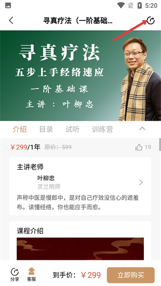 3、進入課程詳情頁面后,點擊右上角的分享圖標(biāo),彈出包含不同分享渠道的選項菜單。