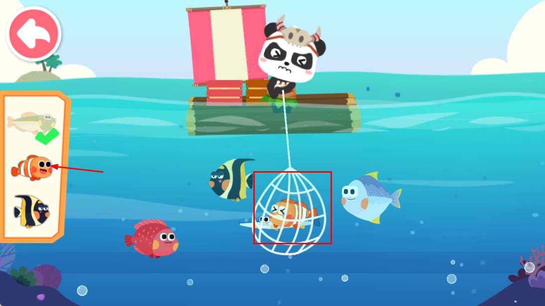 4、在捕魚場景,根據(jù)左側(cè)提示的魚類(如小丑魚),用漁網(wǎng)捕捉對應(yīng)的魚。