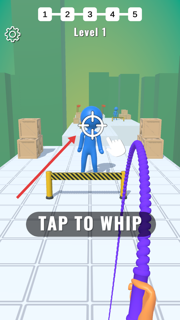 1、進(jìn)入Level1,點擊TAPTOWHIP,用紫色鞭子抽打藍(lán)色小人,開啟關(guān)卡挑戰(zhàn)。