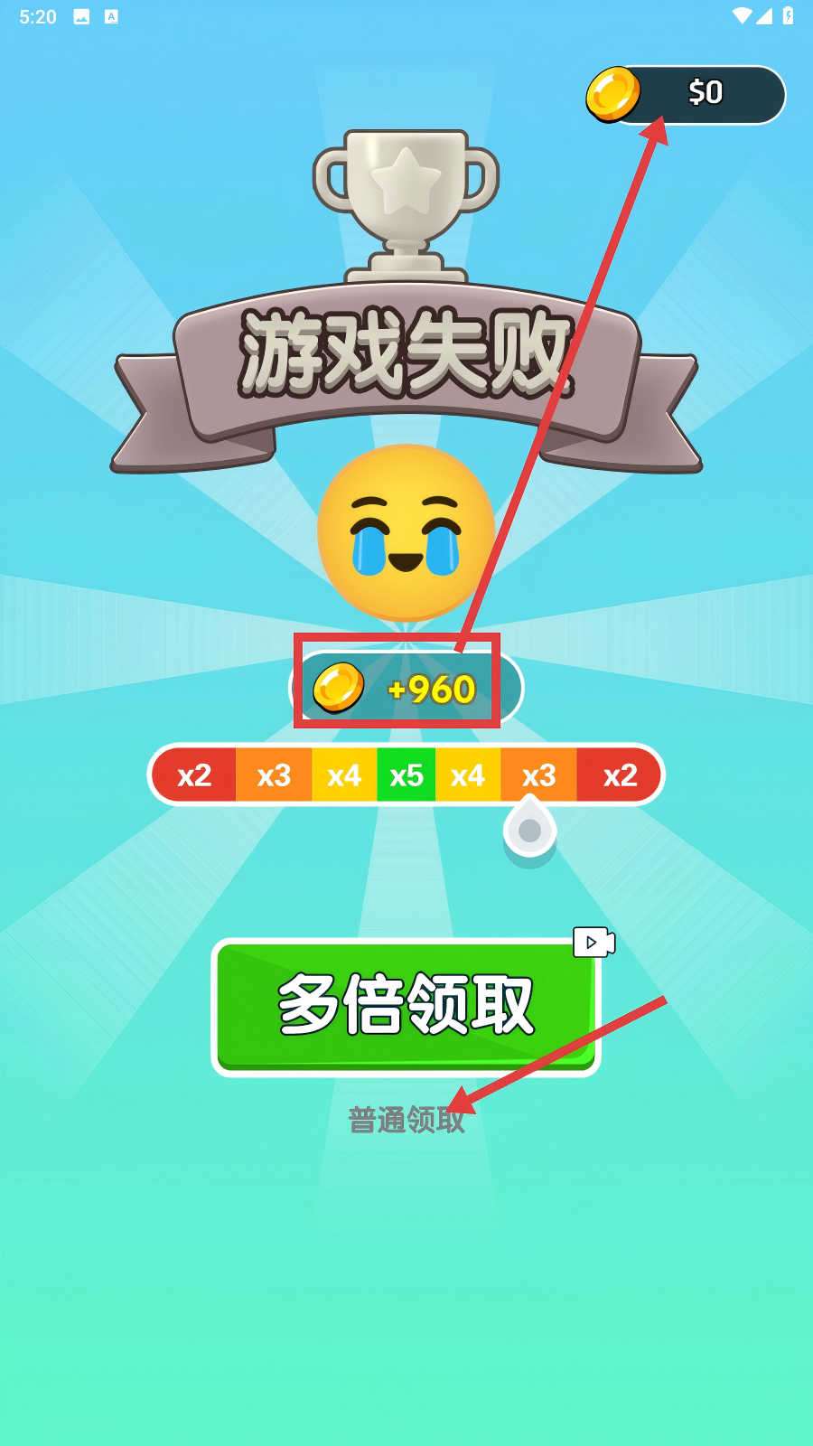 4、若出現(xiàn)【游戲失敗】界面,可選擇【普通領(lǐng)取】獲得基礎(chǔ)金幣獎勵,也能點擊【多倍領(lǐng)取】看廣告獲取更多金幣。