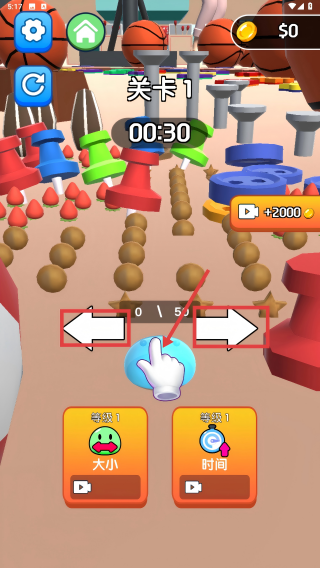 1、進入【關(guān)卡-1】,點擊藍色球體,通過左右箭頭操控其移動,需在【00:30】內(nèi)收集物品,完成【0/50】的收集目標。