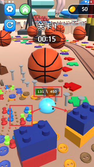 2、操控史萊姆收集彩色小物件,逐步積累收集進度,向【450】的目標推進。