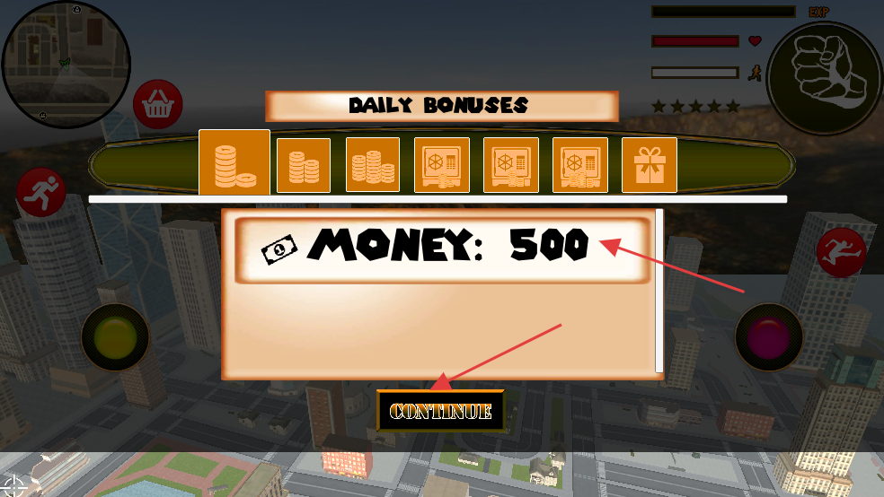 1、點(diǎn)擊“CONTINUE”按鈕領(lǐng)取每日獎勵的500金錢,之后可進(jìn)入游戲主場景,開始游玩。