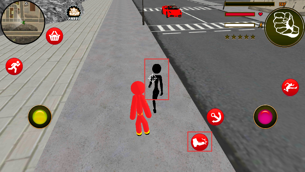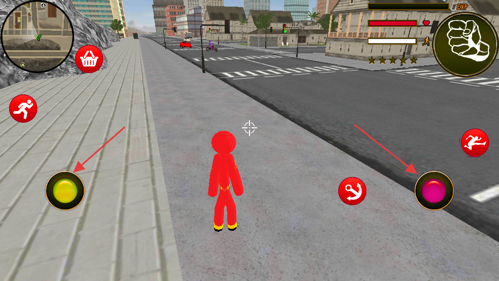 2、操控左側(cè)按鈕控制角色移動方向,右側(cè)粉色按鈕控制角色進(jìn)行攻擊,在城市街道場景中探索。