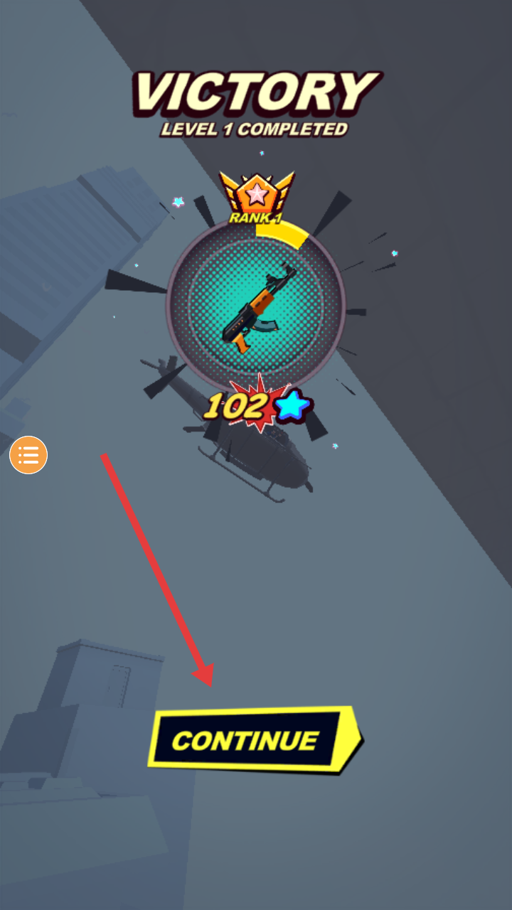 4、成功抵達(dá)直升機后,完成Level1,獲得VICTORY獎勵,點擊CONTINUE繼續(xù)挑戰(zhàn)后續(xù)關(guān)卡,解鎖更多內(nèi)容與獎勵。