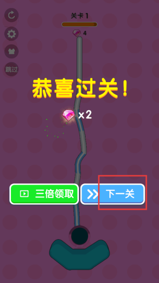 4、關(guān)卡1通過后,獲得2顆粉色鉆石獎勵,點擊藍(lán)色的“下一關(guān)”按鈕,即可進入下一個關(guān)卡繼續(xù)挑戰(zhàn)。