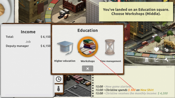 2、當落在教育方塊時,選擇【W(wǎng)orkshops】,推進教育相關的游戲進程,獲取對應效果。
