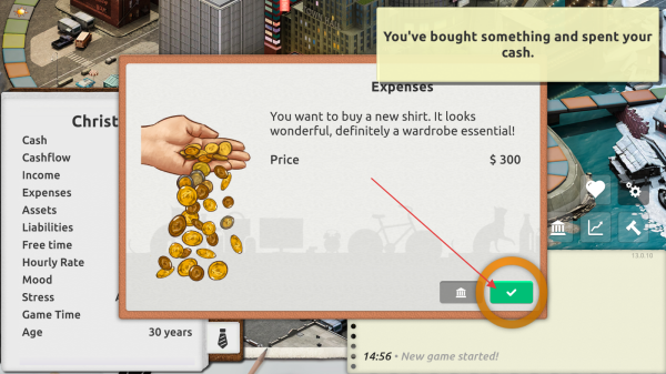 4、面對購物類事件,如購買新襯衫,確認花費后點擊對勾,完成交易,推進游戲劇情。