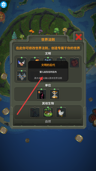 3、在世界法則界面,選擇【文明的后代】等選項,修改世界法則,塑造專屬游戲世界。