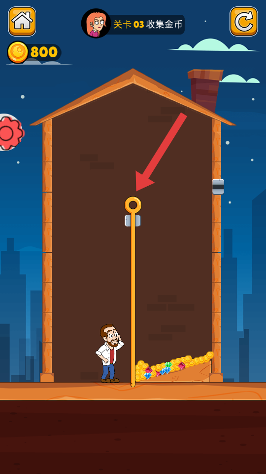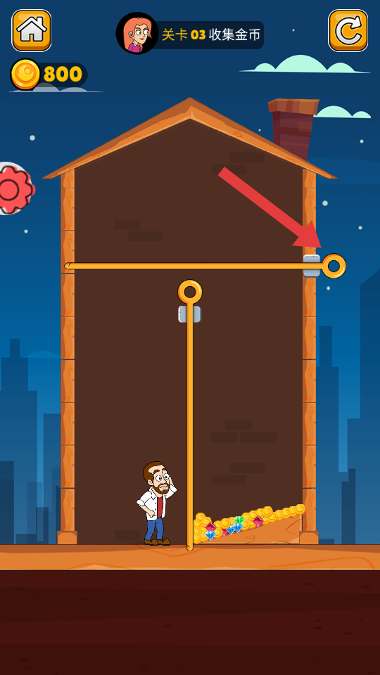 3、移除上方機(jī)關(guān)后,再點(diǎn)擊第二個(gè)機(jī)關(guān)將其移除,清除阻礙金幣的機(jī)關(guān),讓金幣順利掉落。
