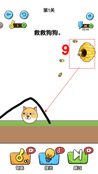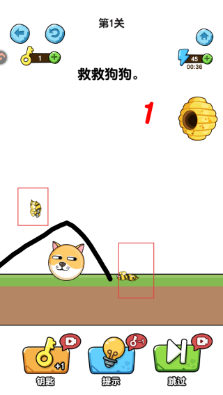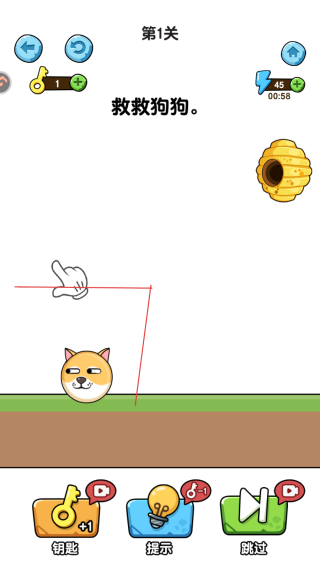 2、第一關(guān)任務(wù)是【救救狗狗】,根據(jù)提示,需在狗狗上方繪制線條,為狗狗搭建防護,抵御蜜蜂攻擊。