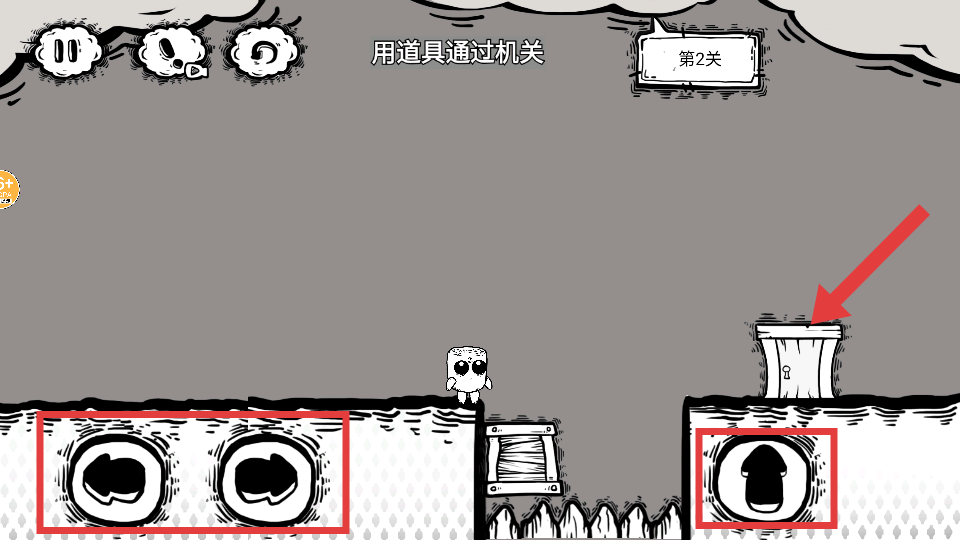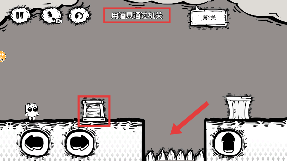 2、進(jìn)入【第2關(guān)】,依據(jù)【用道具通過(guò)機(jī)關(guān)】提示,操控角色將【箱子】移動(dòng)至箭頭處。
