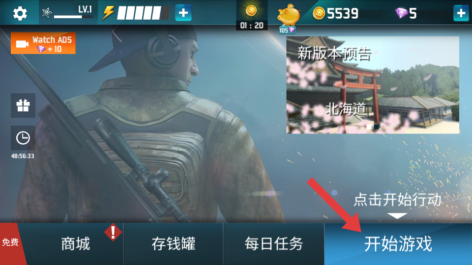 1、在游戲主界面,點擊【開始游戲】按鈕,開啟狙擊任務(wù)之旅。