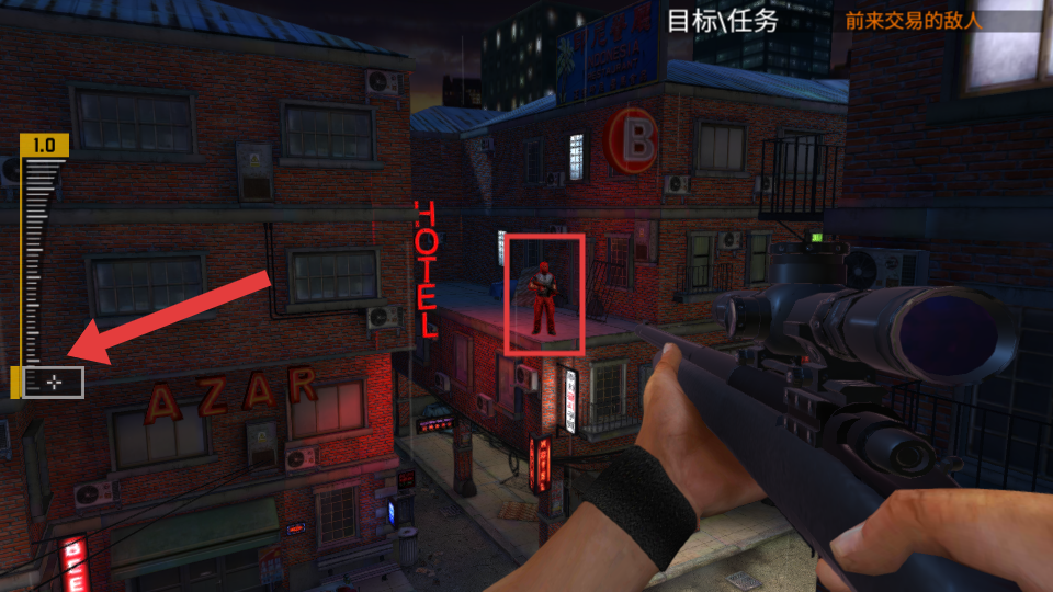 2、進(jìn)入游戲關(guān)卡,觀察場景,找到紅框內(nèi)的目標(biāo)敵人,通過調(diào)整左側(cè)紅框內(nèi)的【縮放按鈕】。