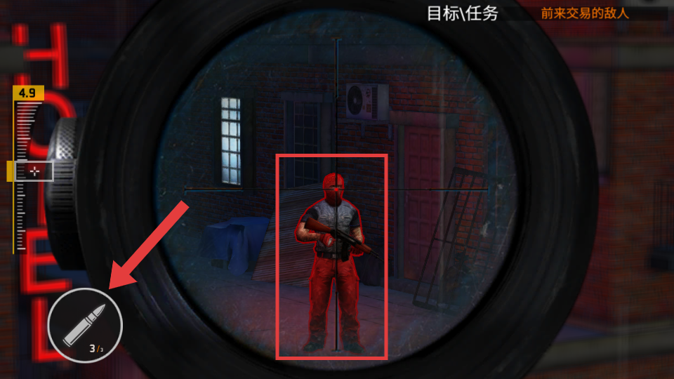 3、使用瞄準(zhǔn)鏡鎖定目標(biāo)敵人后,點擊左下角的【子彈圖標(biāo)按鈕】進(jìn)行射擊。