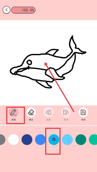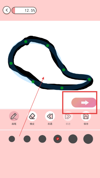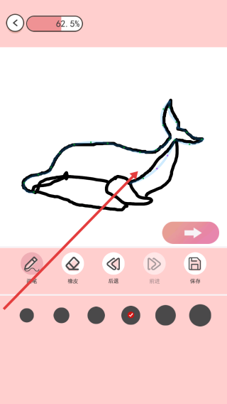 2、進入繪制界面,會有輪廓引導,按照提示,點擊前進按鈕,逐步勾勒鯨魚的線條,開始繪制過程。