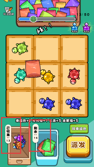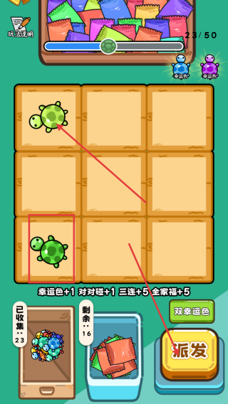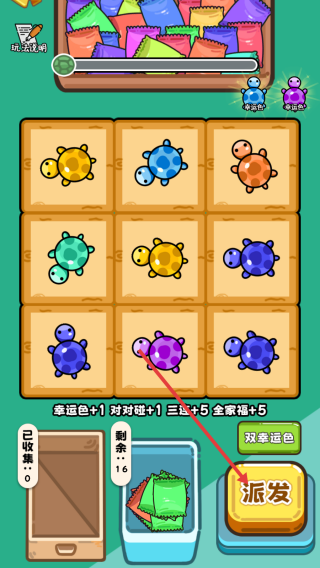 4、繼續(xù)觀察方格內(nèi)烏龜,尋找可配對的相同顏色烏龜,點擊【派發(fā)】投放,不斷消除,積累收集數(shù)量。