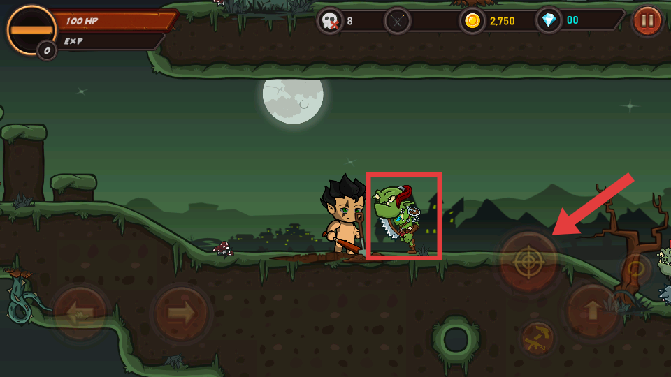 3、當(dāng)遇到如紅框內(nèi)的綠色怪物敵人時,及時點擊攻擊按鈕,精準(zhǔn)打擊敵人。