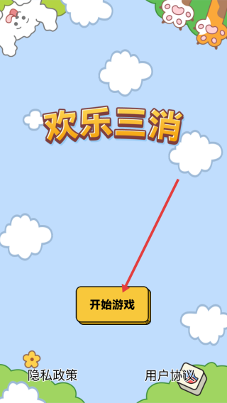 1、進(jìn)入“歡樂(lè)三消”游戲,點(diǎn)擊【開(kāi)始游戲】按鈕,進(jìn)入關(guān)卡1,開(kāi)啟消除挑戰(zhàn)。